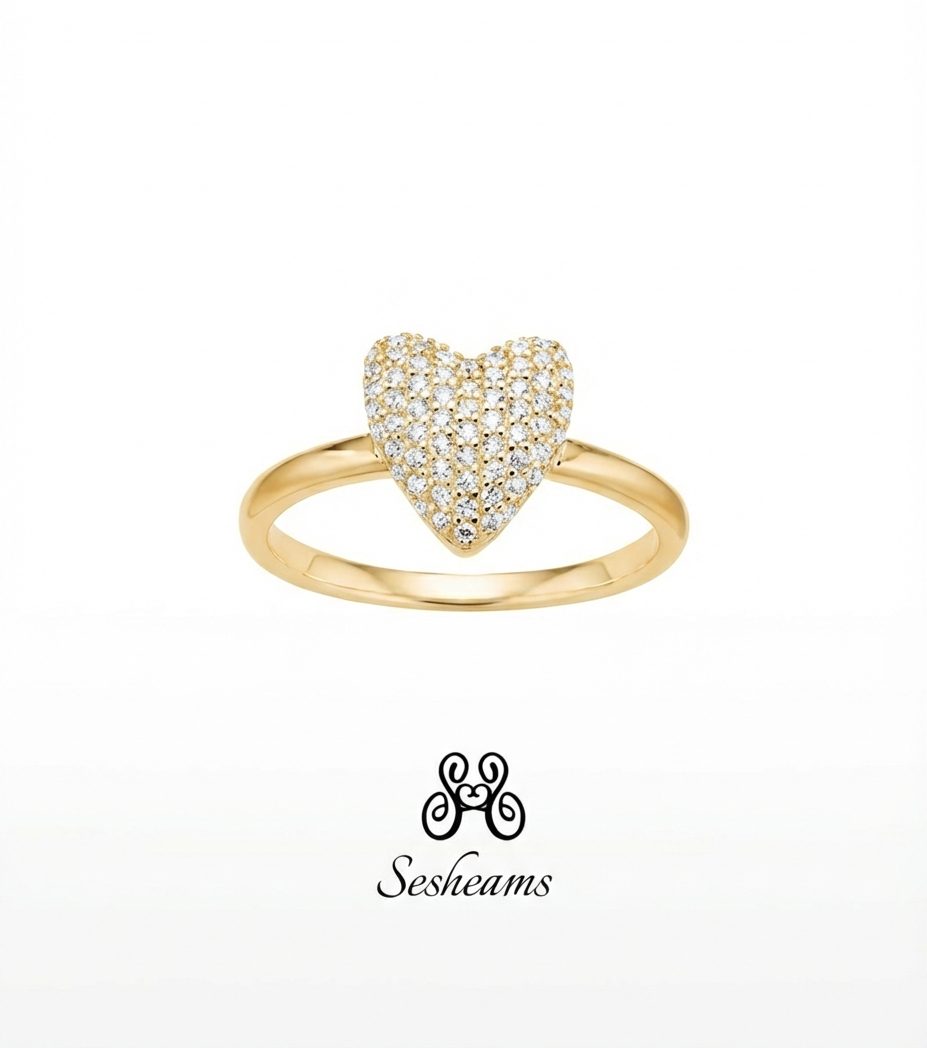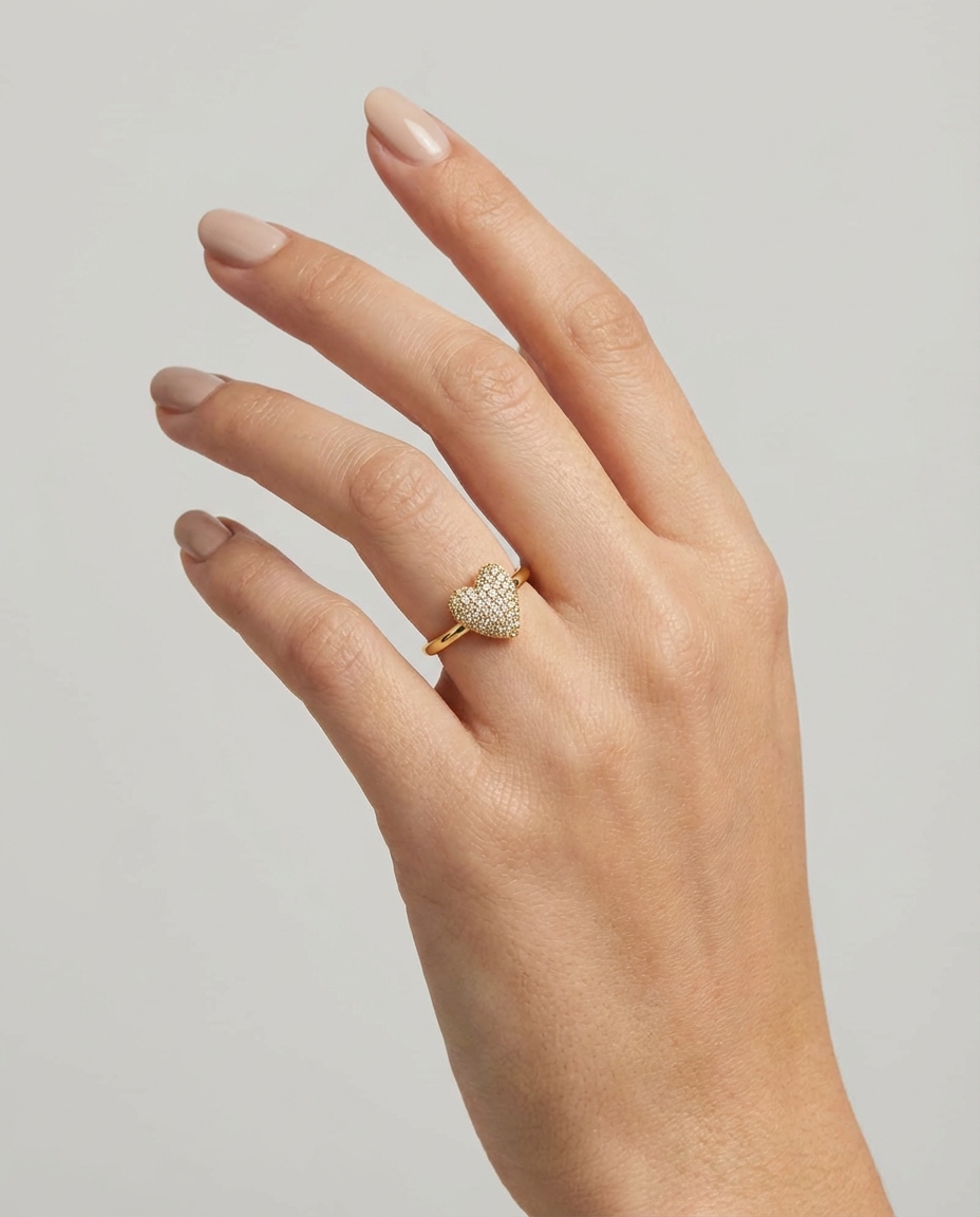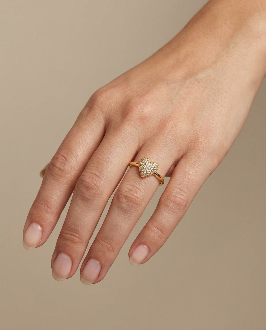 Anello elegante in argento 925 placcato oro, impreziosito da un cuore pavé completamente ricoperto di zirconi bianchi luminosi, incastonati con precisione per riflettere la luce in modo uniforme e raffinato.
