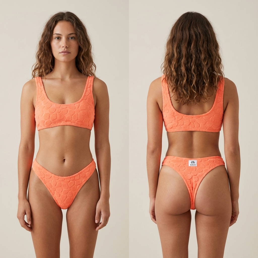Un bikini due pezzi dal design esclusivo e realizzato artigianalmente: il top imbottito è comodo e avvolgente, mentre lo slip è un modello brasiliana, pensato per valorizzare la silhouette con eleganza. Realizzato in morbida spugna con fantasia floreale, nei toni dell’arancione fluo e vivido.
