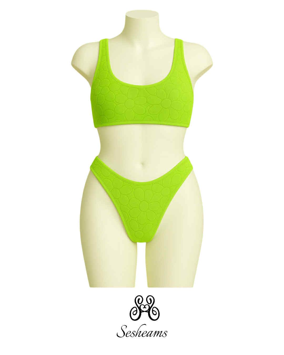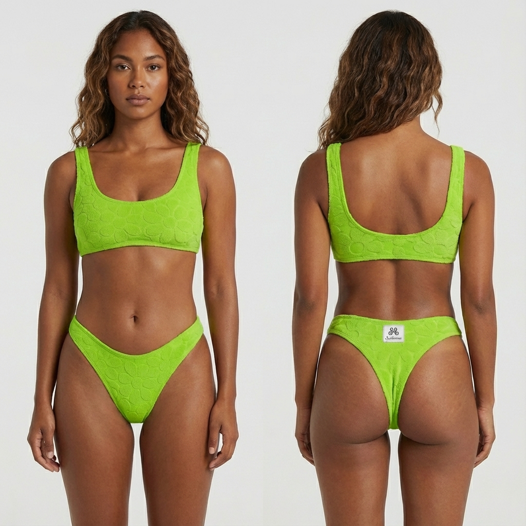 Un bikini due pezzi dal design unico e originale realizzato artigianalmente: il top imbottito è comodo e avvolgente, mentre lo slip è un modello brasiliana, pensato per esaltare la silhouette con eleganza. Realizzato in morbida spugna con fantasia floreale, nei toni del verde neon vivido.