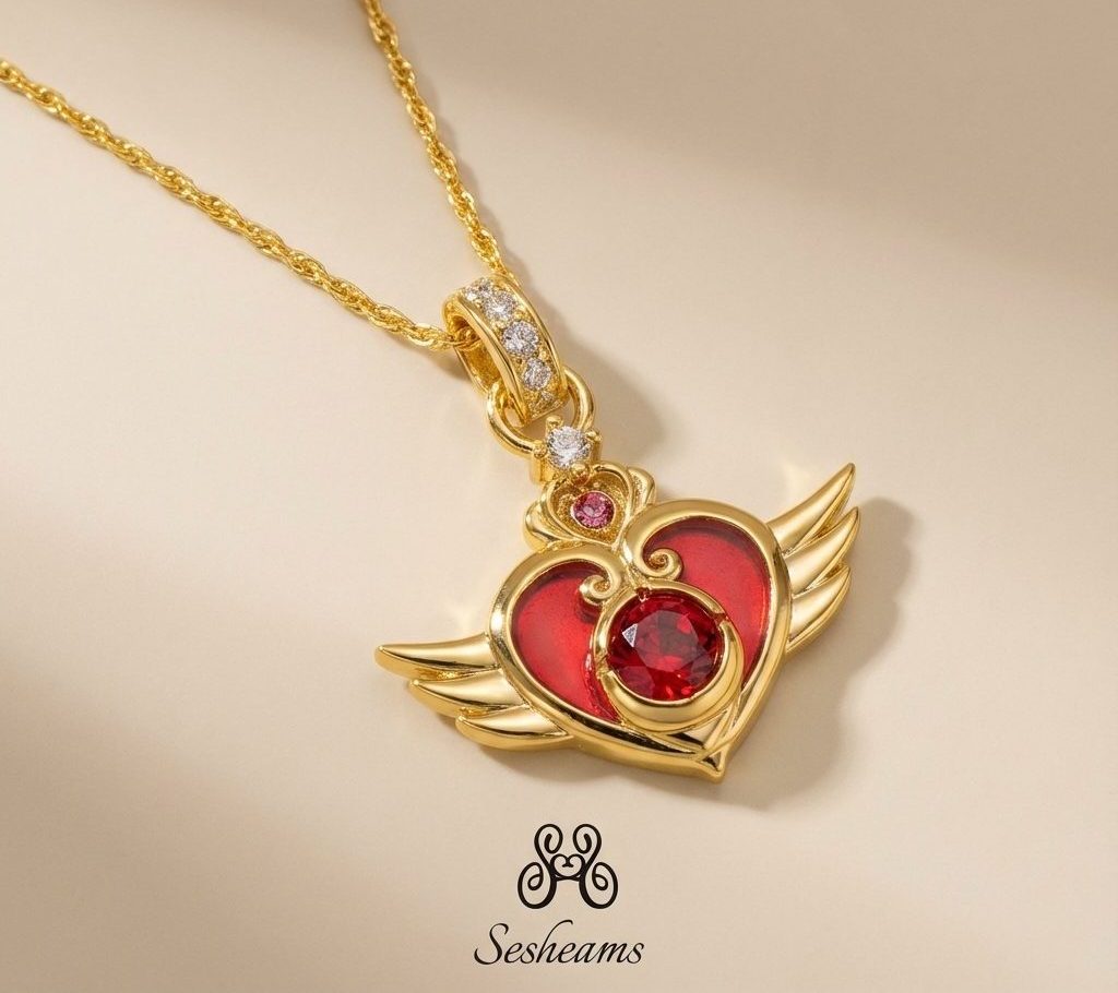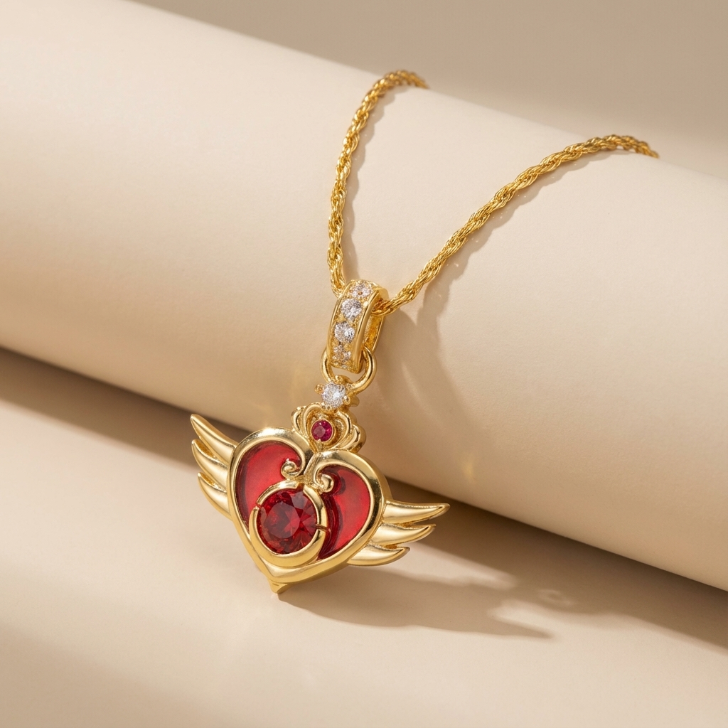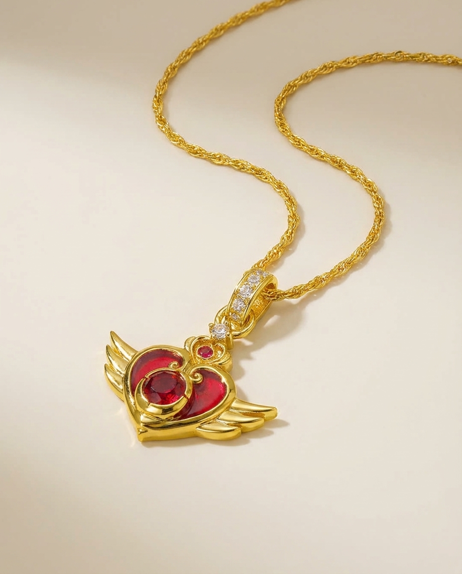 La collana a treccia è rifinita con una placcatura color oro impreziosita da cristalli con ciondolo a forma di cuore con le ali dorate ispirata al cuore di Sailor Moon.