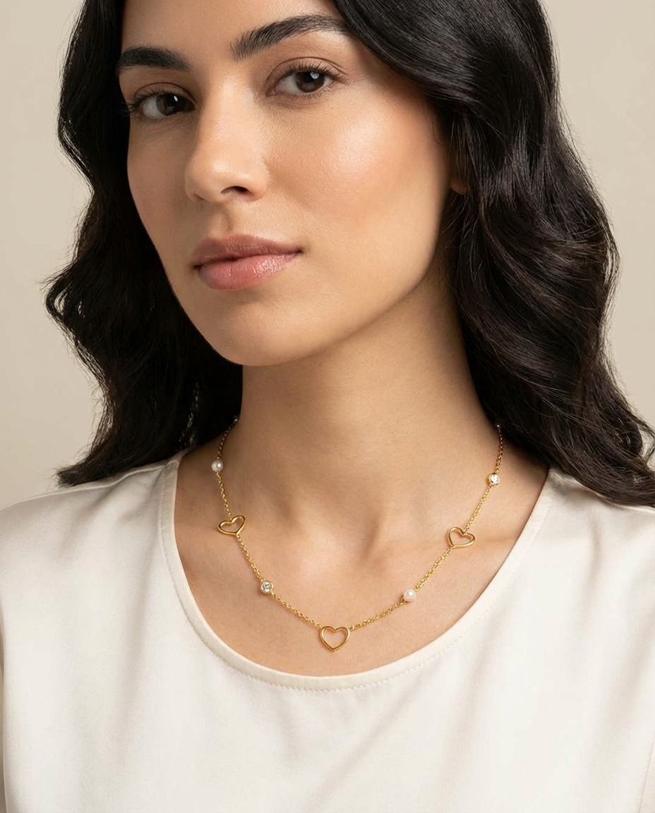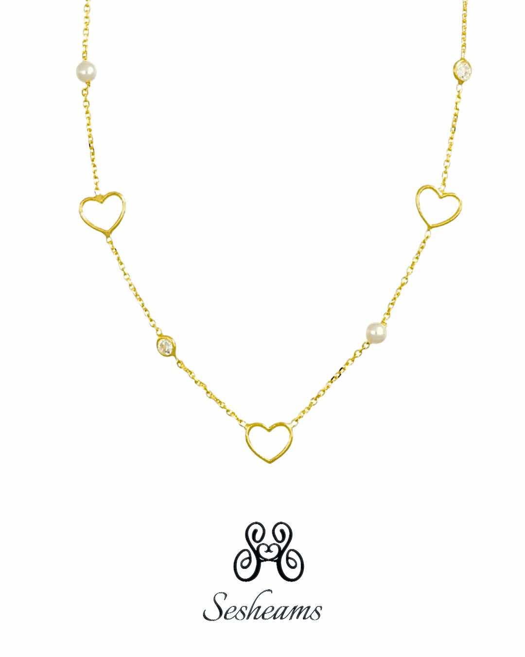 Realizzata in argento 925 placcato oro, composta da perle, cuori traforati e zirconi bianchi.