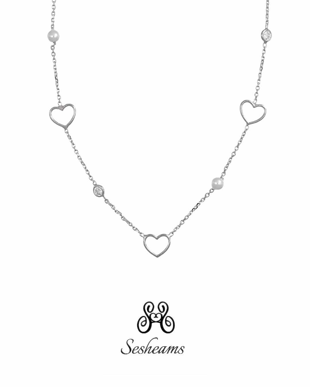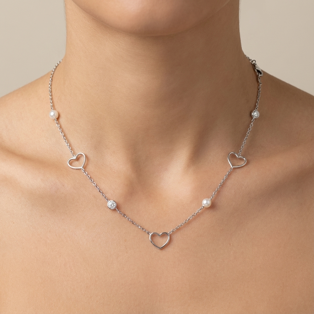 • Collana con perle e cuori in argento rodiato