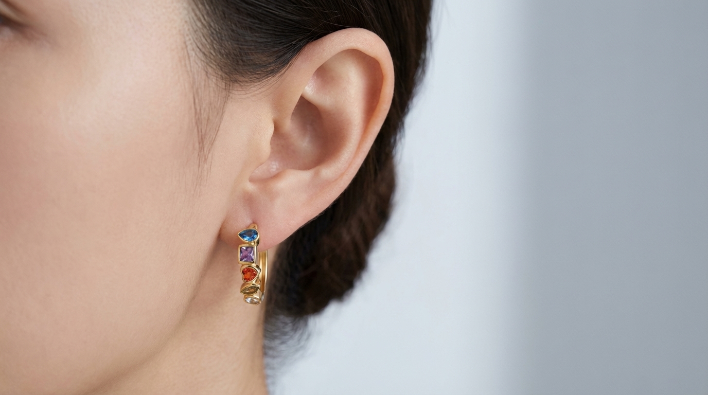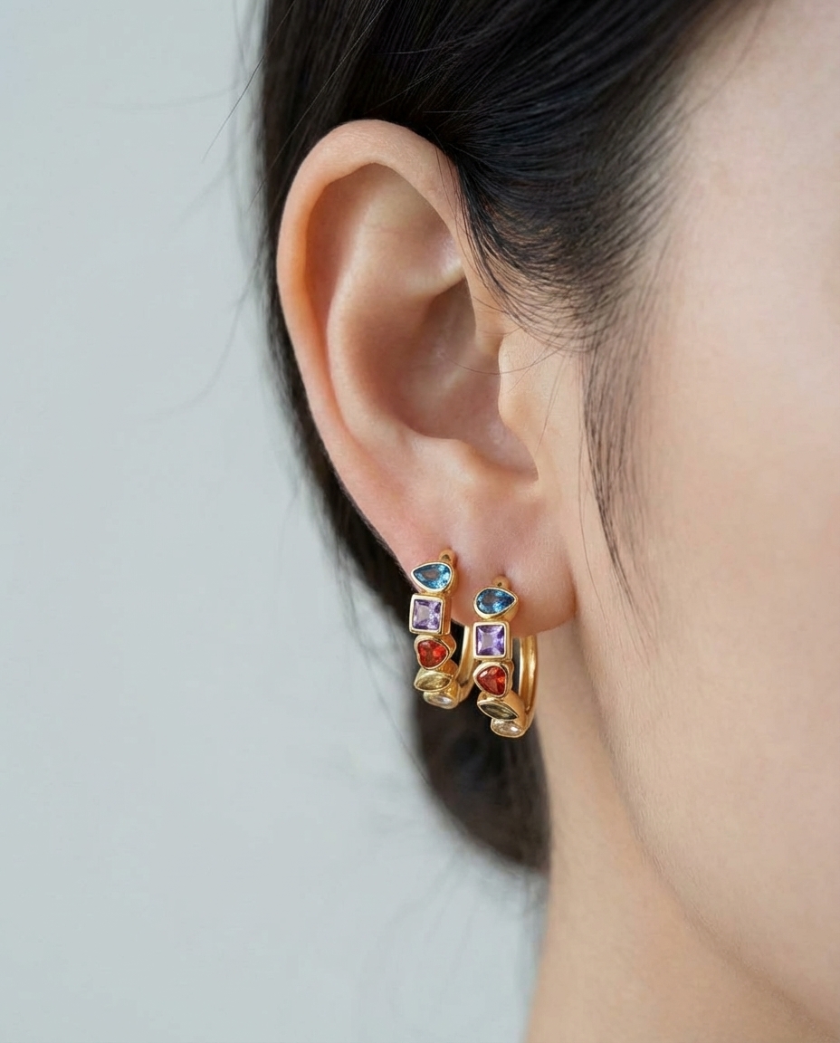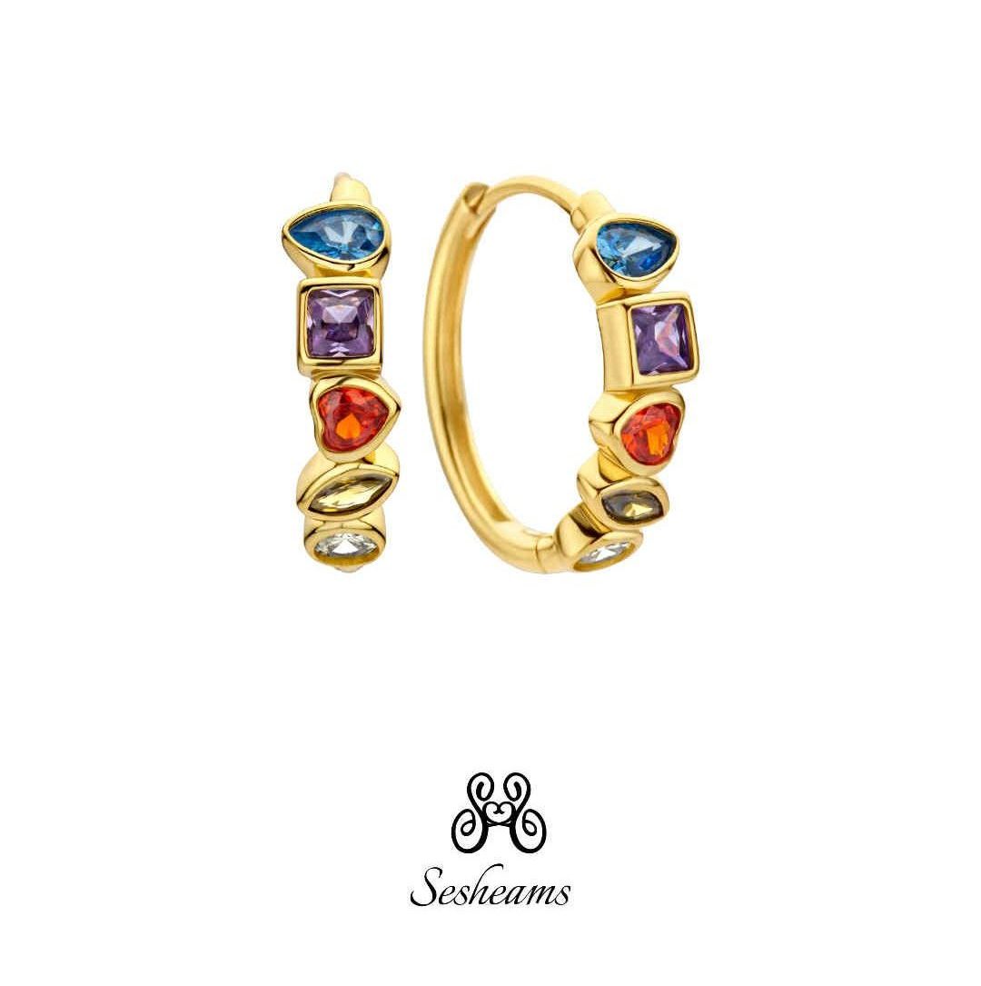 Un viaggio di luce e colore racchiuso in un design essenziale. Questi orecchini a cerchio, in argento 925 placcato oro, sono impreziositi da cinque zirconi colorati taglio brillante, incastonati per creare un gioco di riflessi unico. Si adattano con naturalezza ad ogni stile, dal più casual alle serate più raffinate. Inclusa la scatola rosa Sesheams con logo dorato: un tocco di lusso in ogni dettaglio.