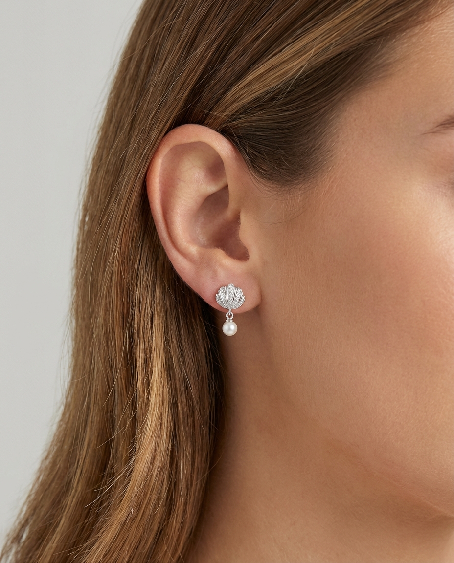La superficie della conchiglia è impreziosita da zirconi bianchi luminosi, incastonati con precisione per riflettere la luce con eleganza. A completare il design, una perla pendente, delicata e sofisticata, che dona movimento e armonia al gioiello.