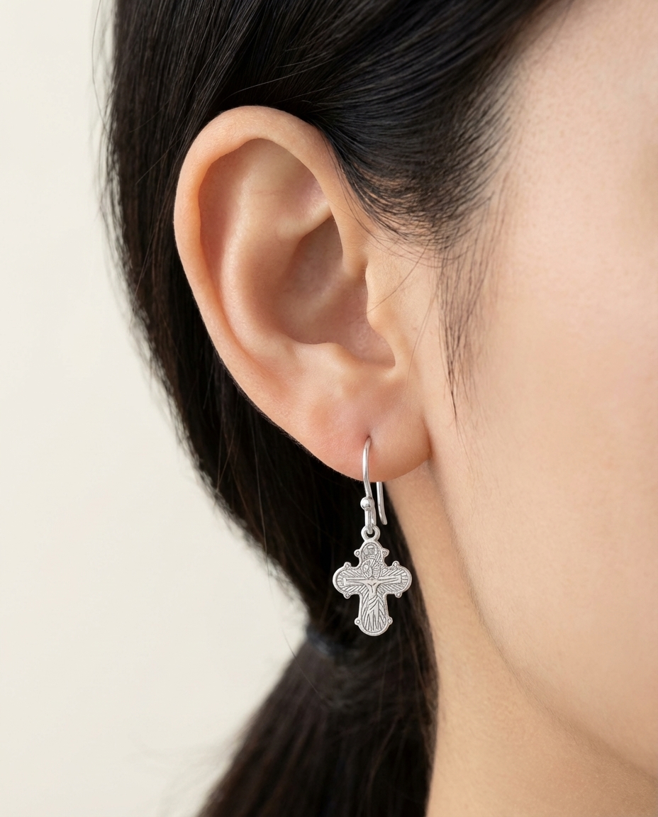 Leggeri, luminosi e dal design essenziale: questi orecchini sono pensati per chi ama uno stile raffinato, minimal e profondamente simbolico. Presentano una croce incisa con Cristo stilizzato in rilievo, una piccola opera di arte iconografica che racchiude un significato intimo: un segno di protezione, di forza silenziosa e di grazia che accompagna ogni passo.