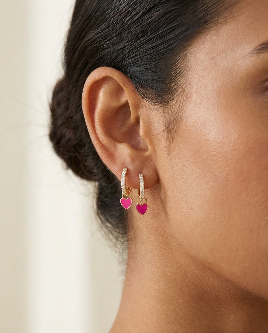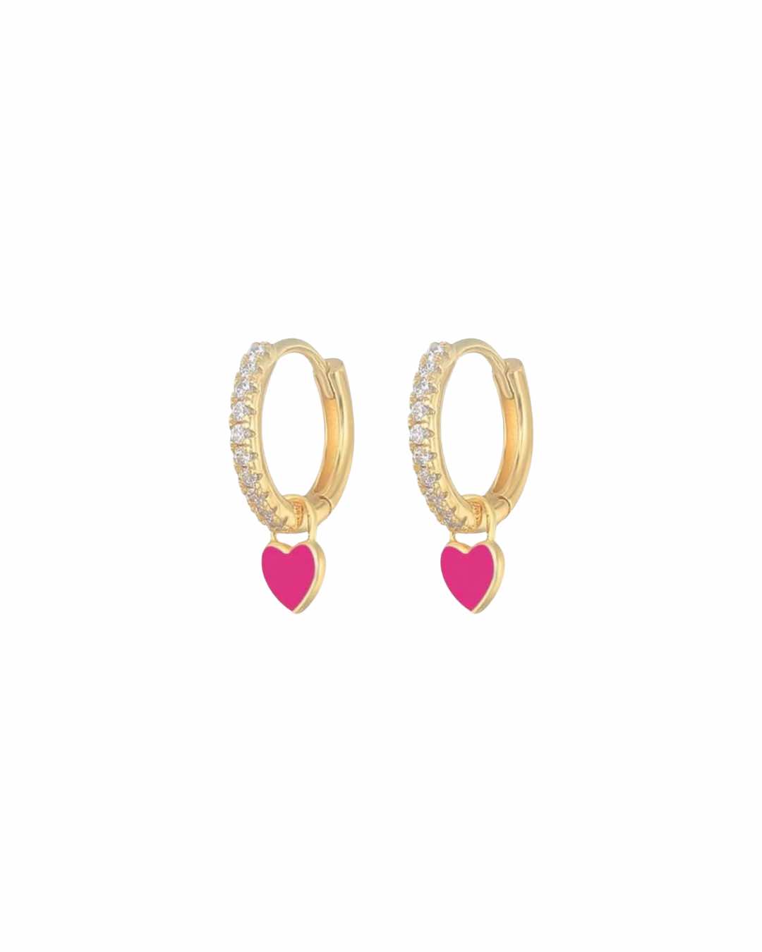 Orecchini “cuoricino” in argento 925 placcato oro, pieni di diamanti intorno al loro cerchio e un cuore appeso in basso che li completa.