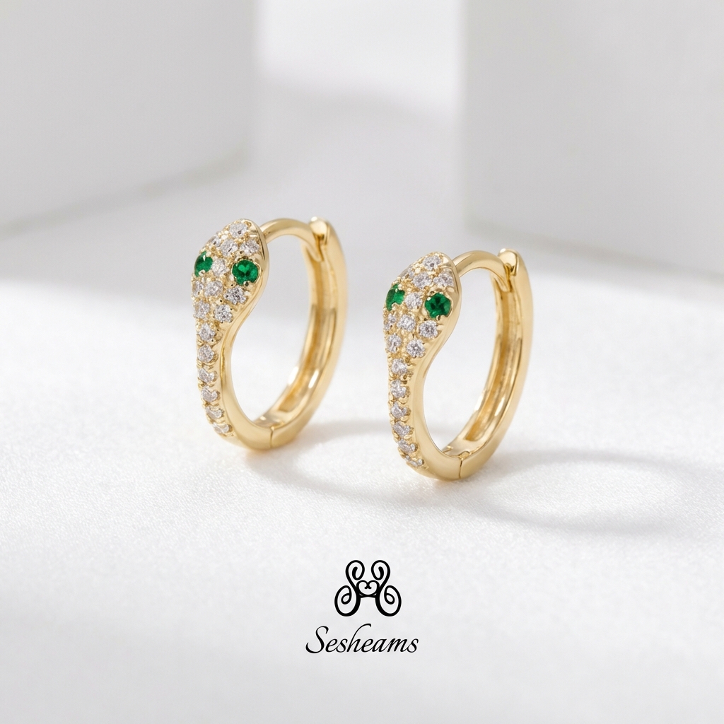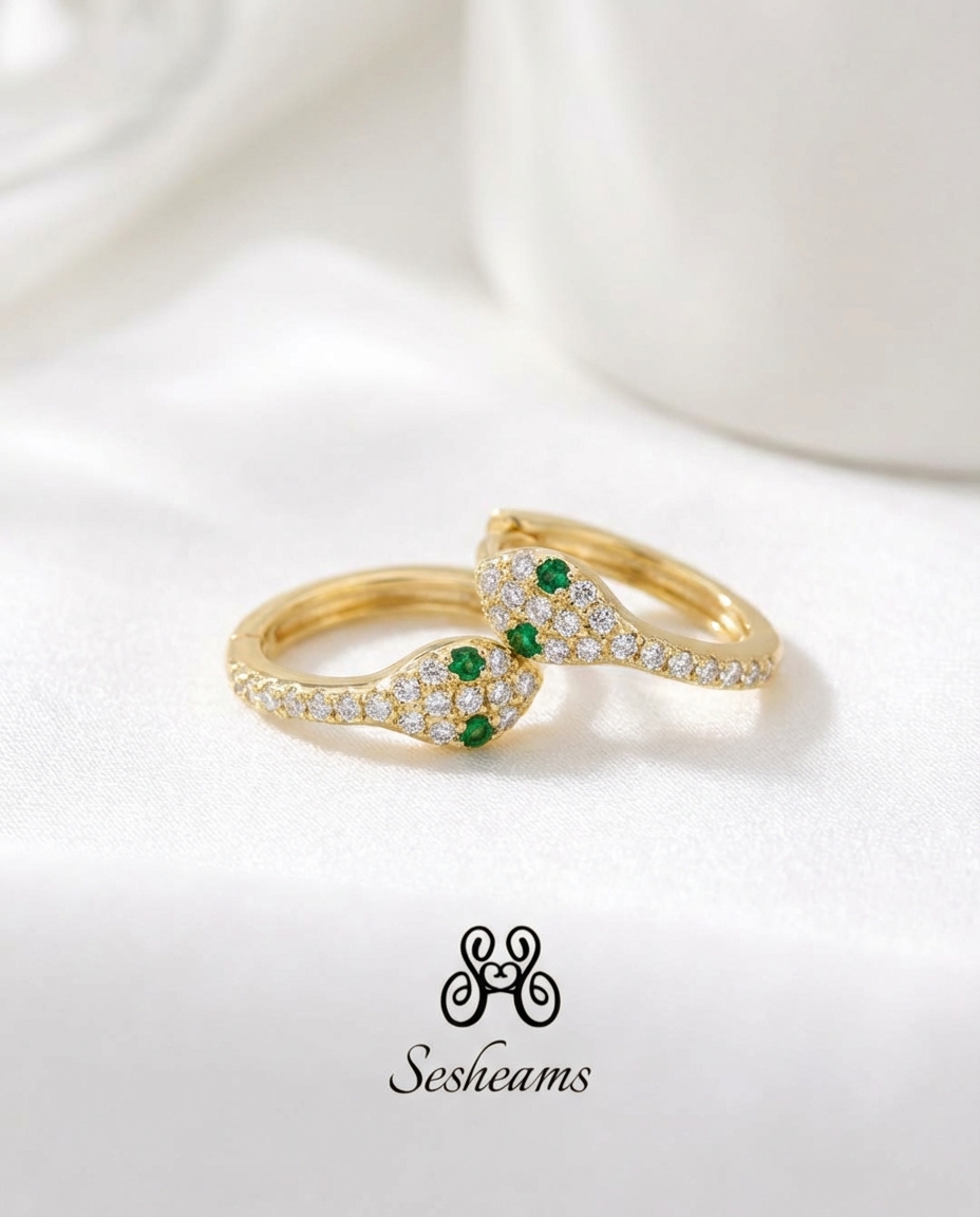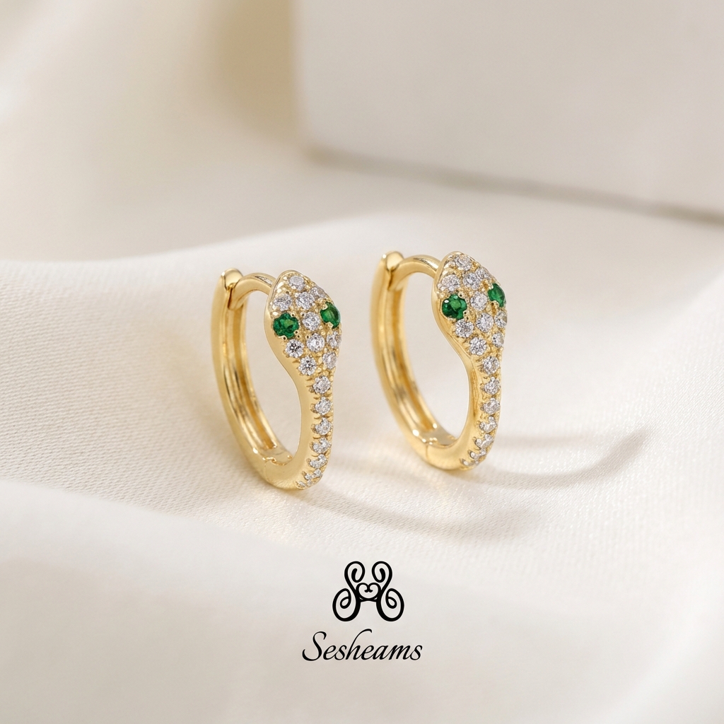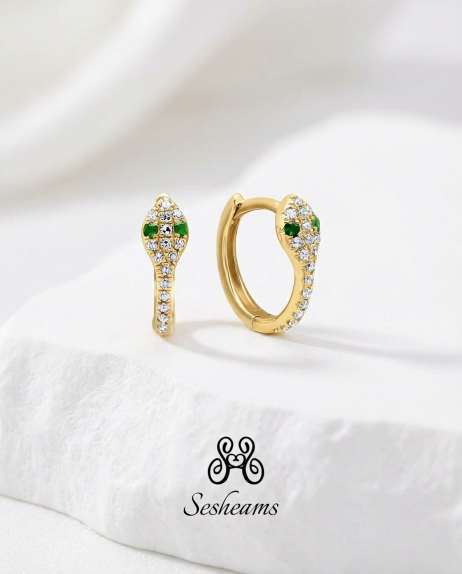 Orecchini Serpente in Argento 925 placcato oro con Zirconi Bianchi e Verdi