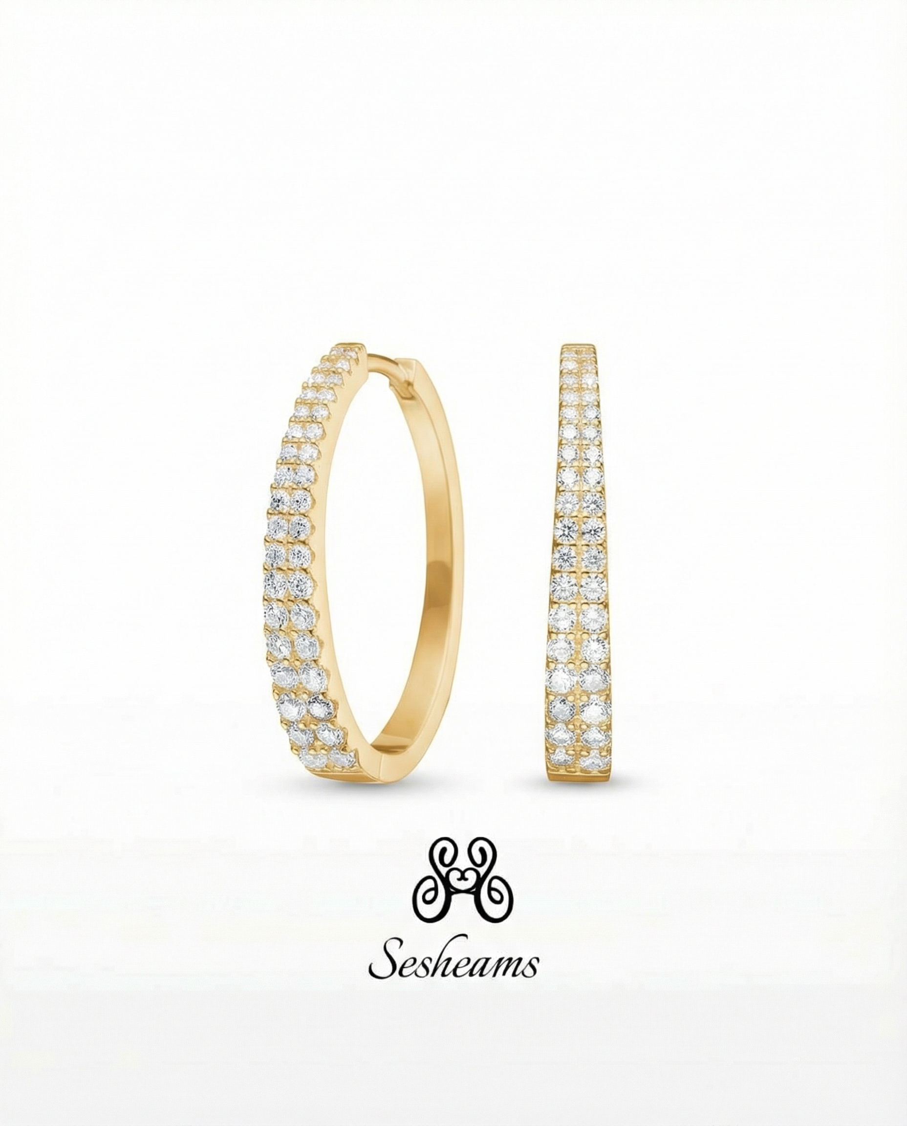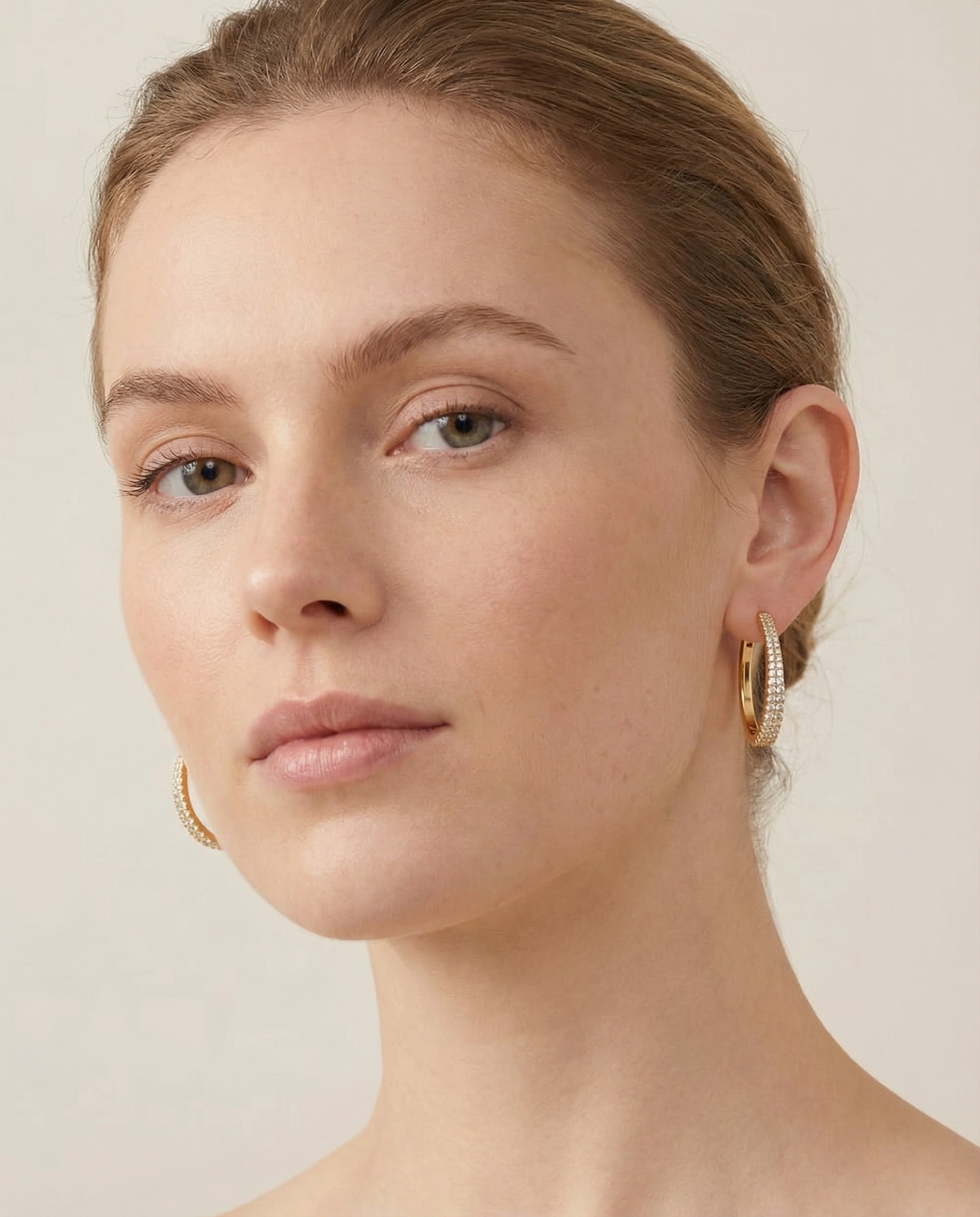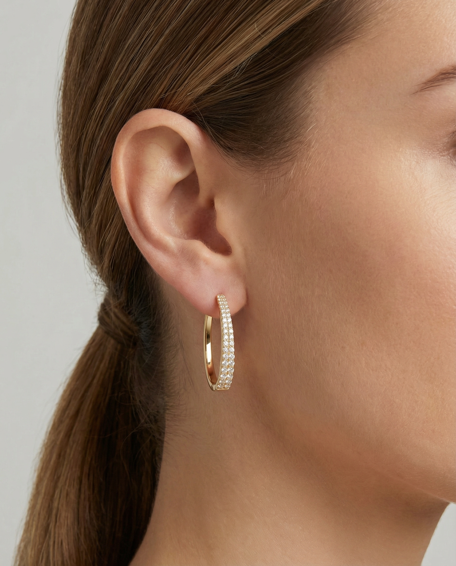 La superficie è completamente impreziosita da zirconi bianchi luminosi, incastonati con precisione per riflettere la luce in modo uniforme e brillante. Il design pulito ed equilibrato rende questi orecchini versatili e senza tempo, perfetti da indossare ogni giorno o per completare un look più sofisticato.